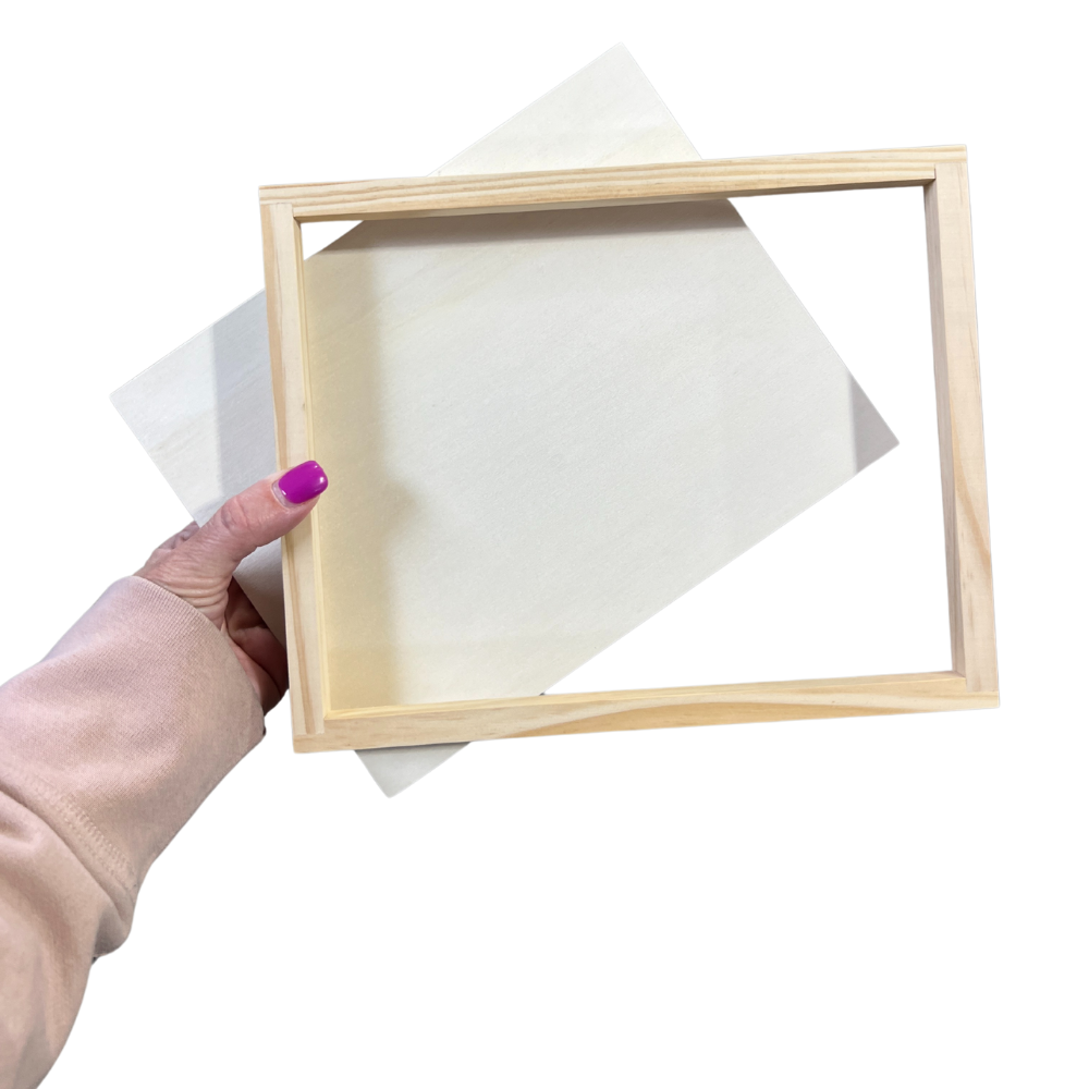 8x10 framed wood sign. Unfinished and the backer board comes out for easy painting and staining. Stands on its own.