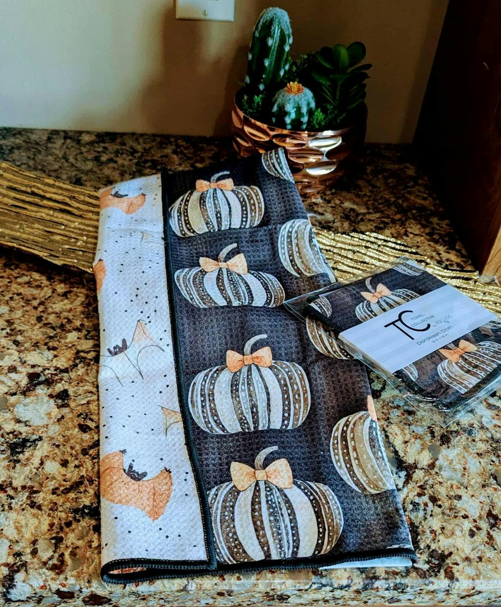 Get ready for a hauntingly good time with our fun reversible towel – two prints, one towel! One side features an adorable pattern of charming white and black striped pumpkins each tied with a cute orange bow, all on a sleek dark background. Flip it over for a playful flight of creamy white and warm orange bats fluttering across a light, subtly dotted background. It's the perfect way to add a touch of charming Halloween spirit to your home!