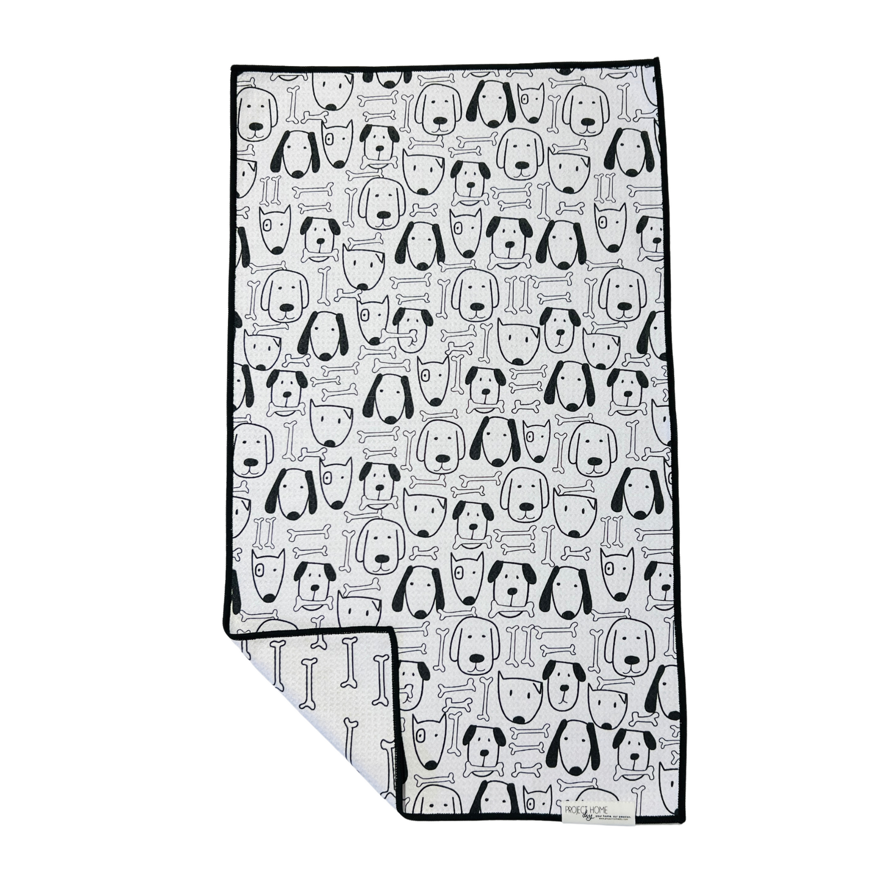 Get ready for some serious tail-wagging with this double-sided delight! One side is a hilarious hodgepodge of happy hound faces, all drawn in bold black lines against a bright white backdrop. It's a dog lover's dream! Flip it over for a clean and classic pattern of black outlined bones, also on a crisp white canvas. And to keep things sleek, we've added a touch of dark gray stitching around the edges. It's the perfect towel for anyone who loves their furry friends!