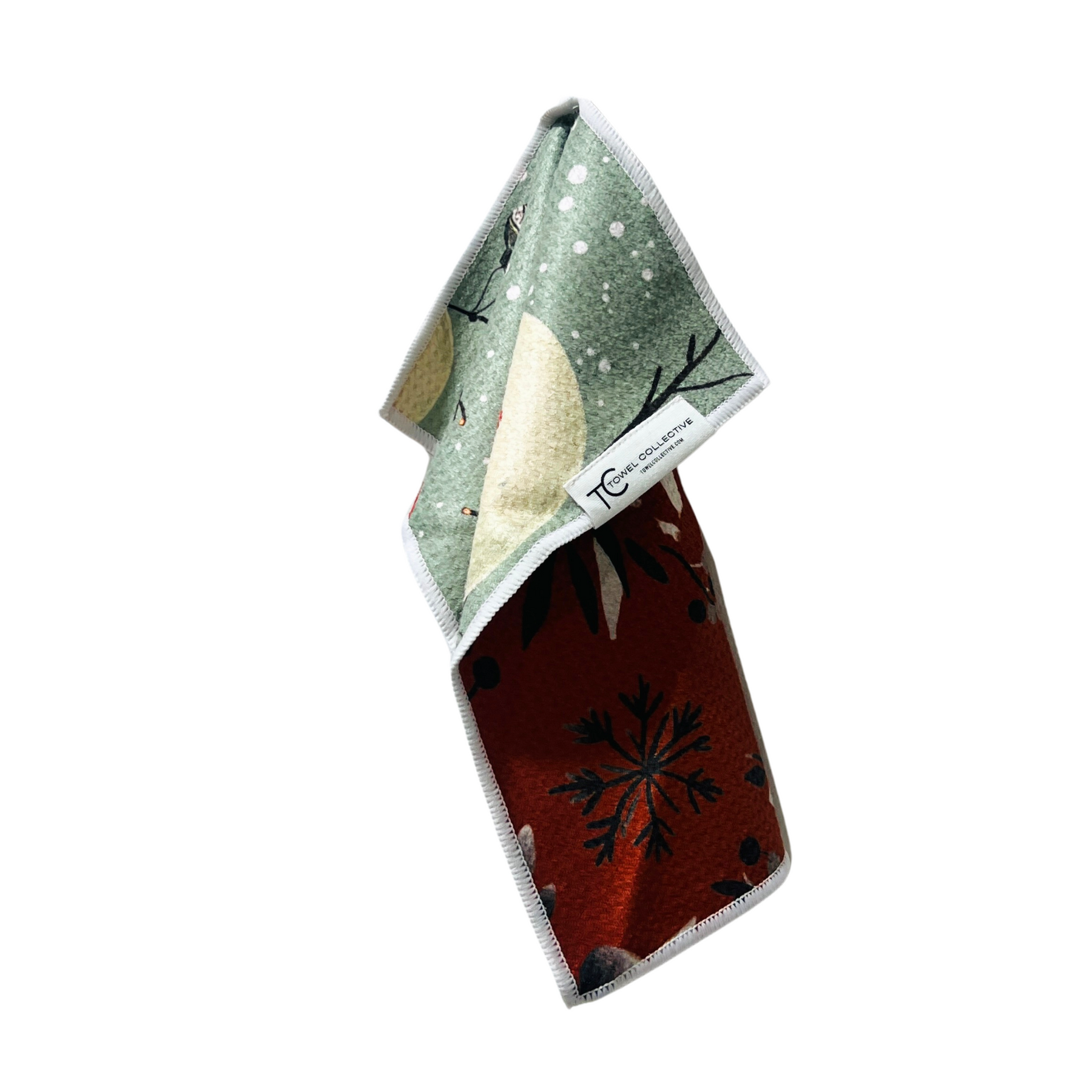 Get into the holiday spirit with our charming reversible towel – two prints, one towel! One side features an adorable happy snowman in a festive red hat and scarf, surrounded by delicate snow falling, bare branches, and cheerful red ornaments on a soft mint green background. Flip it over for a sophisticated and modern holiday look with a striking pattern of deep red florals, dark green leaves, and black berries and accents on a rich terracotta red background. It's the perfect blend of playful winter charm and elegant holiday style for your home!
