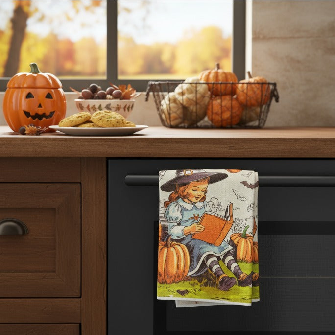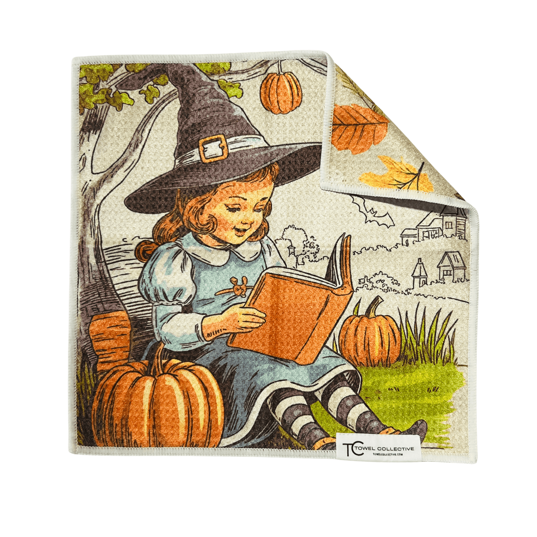 Step into a storybook wonderland with our elegant reversible towel – two prints, one towel! One side features an old school storybook child dressed as a witch, reading a book amidst pumpkins and bats in creamy white, while the reverse side showcases a repeating vintage Halloween pattern. It's the perfect blend of winter charm and refined style for your home!