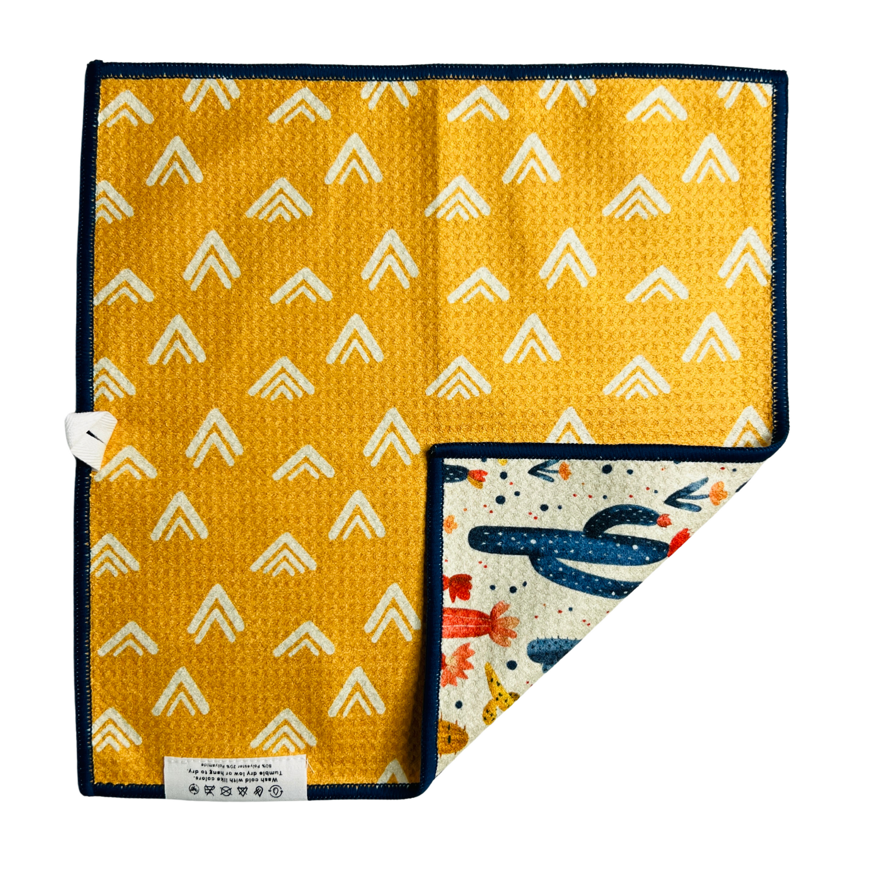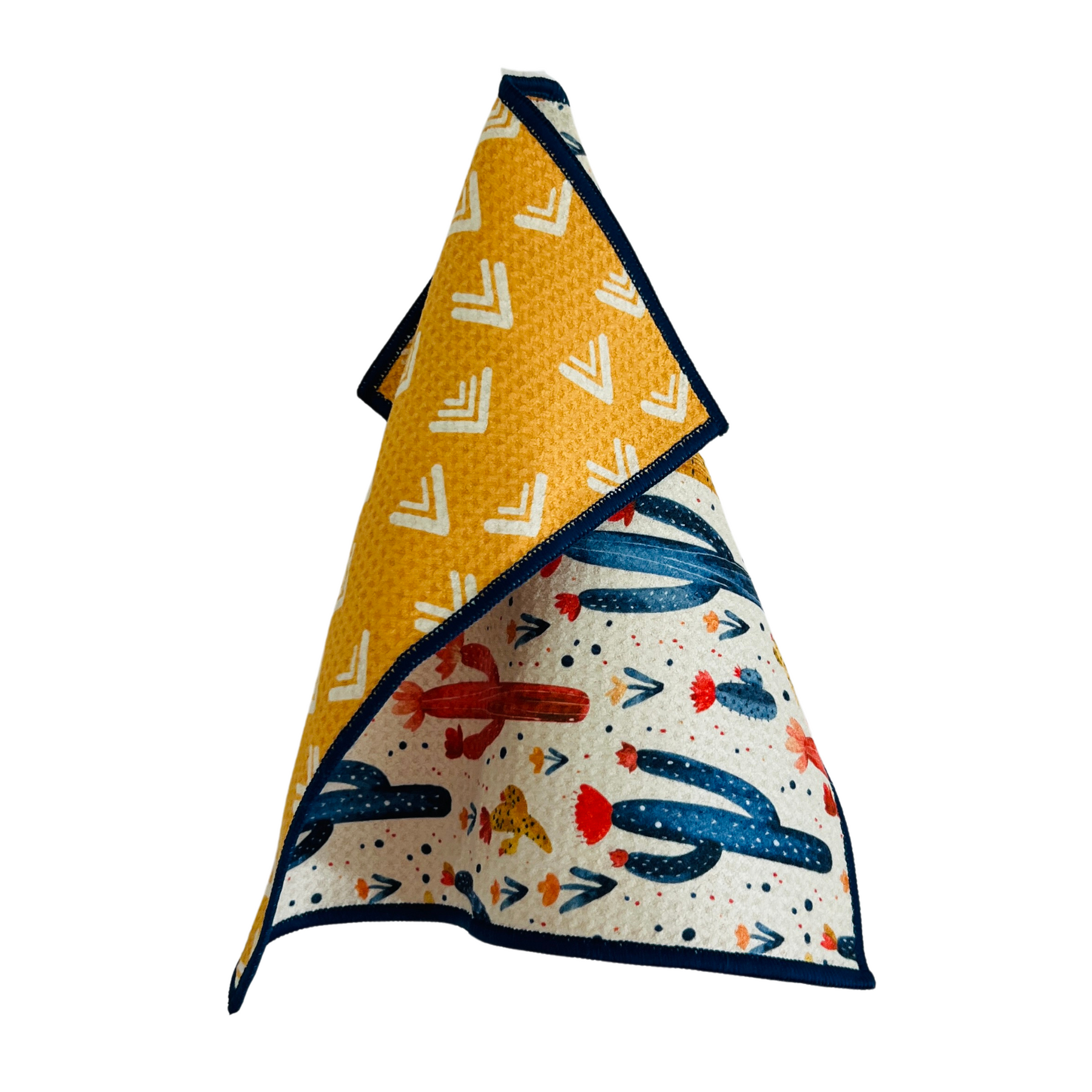 Desert cacti meet golden triangles in this towel, bringing a touch of Southwestern charm and geometric pattern to your day! One side features a playful cactus pattern with blue, red, yellow, and green accents on a cream background, while the other showcases a repeating triangle pattern in gold and cream, all finished with a dark blue stitch