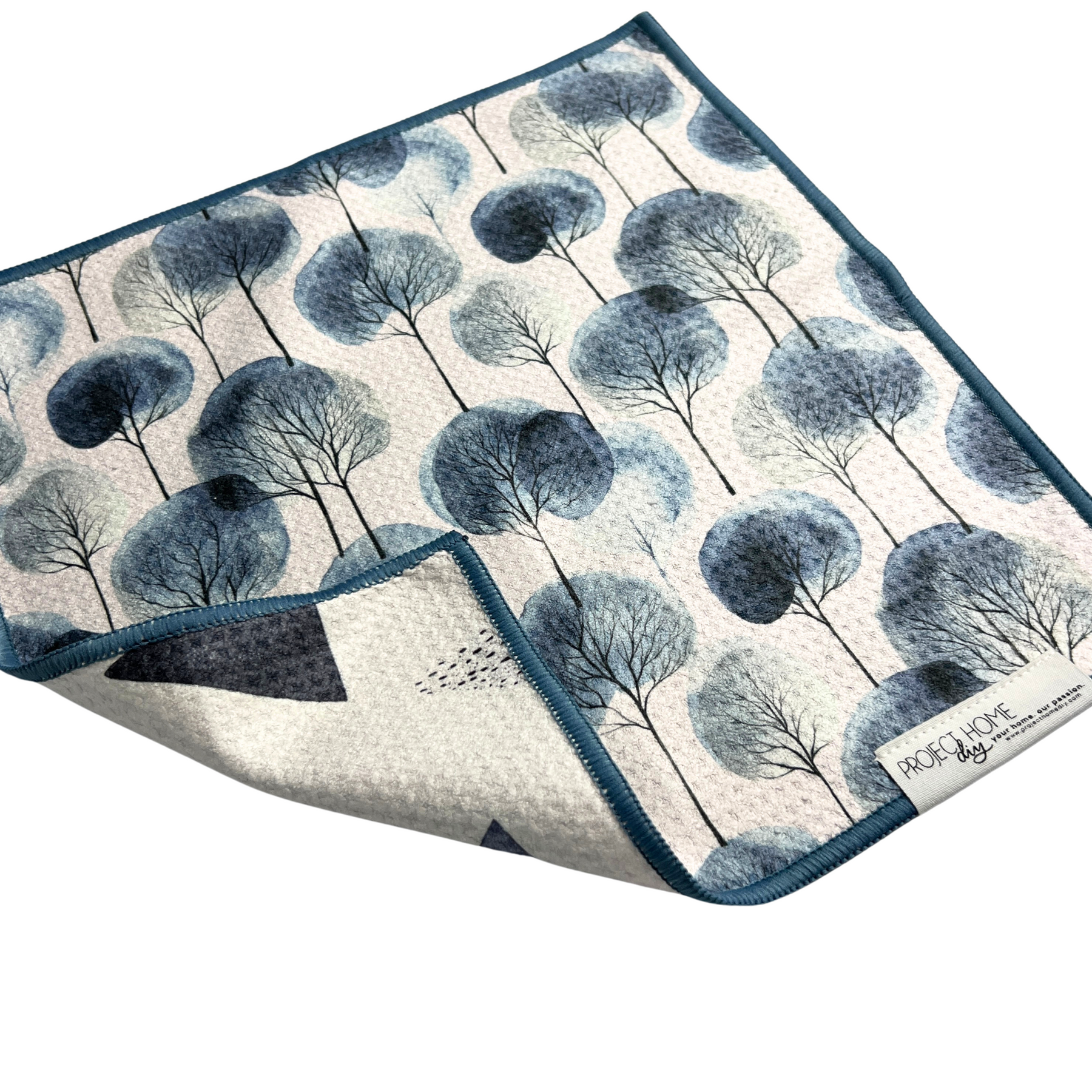 Watercolor trees meet geometric triangles in this towel, bringing a touch of serene nature and modern pattern to your day! One side features a dreamy forest scene with blue and gray trees on a white background, while the other showcases a scattering of dark blue, light blue, and white triangles, all finished with a dark blue stitch.