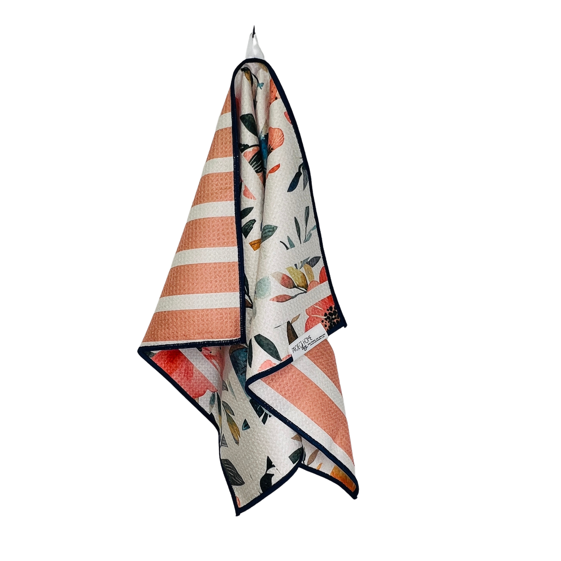 Watercolor florals meet classic stripes in this towel, bringing a touch of artistic charm and timeless pattern to your day! One side features floral watercolor stripes with pink, blue, orange, and green accents on a cream background, while the other showcases light orange and white stripes, all finished with a teal stitch.