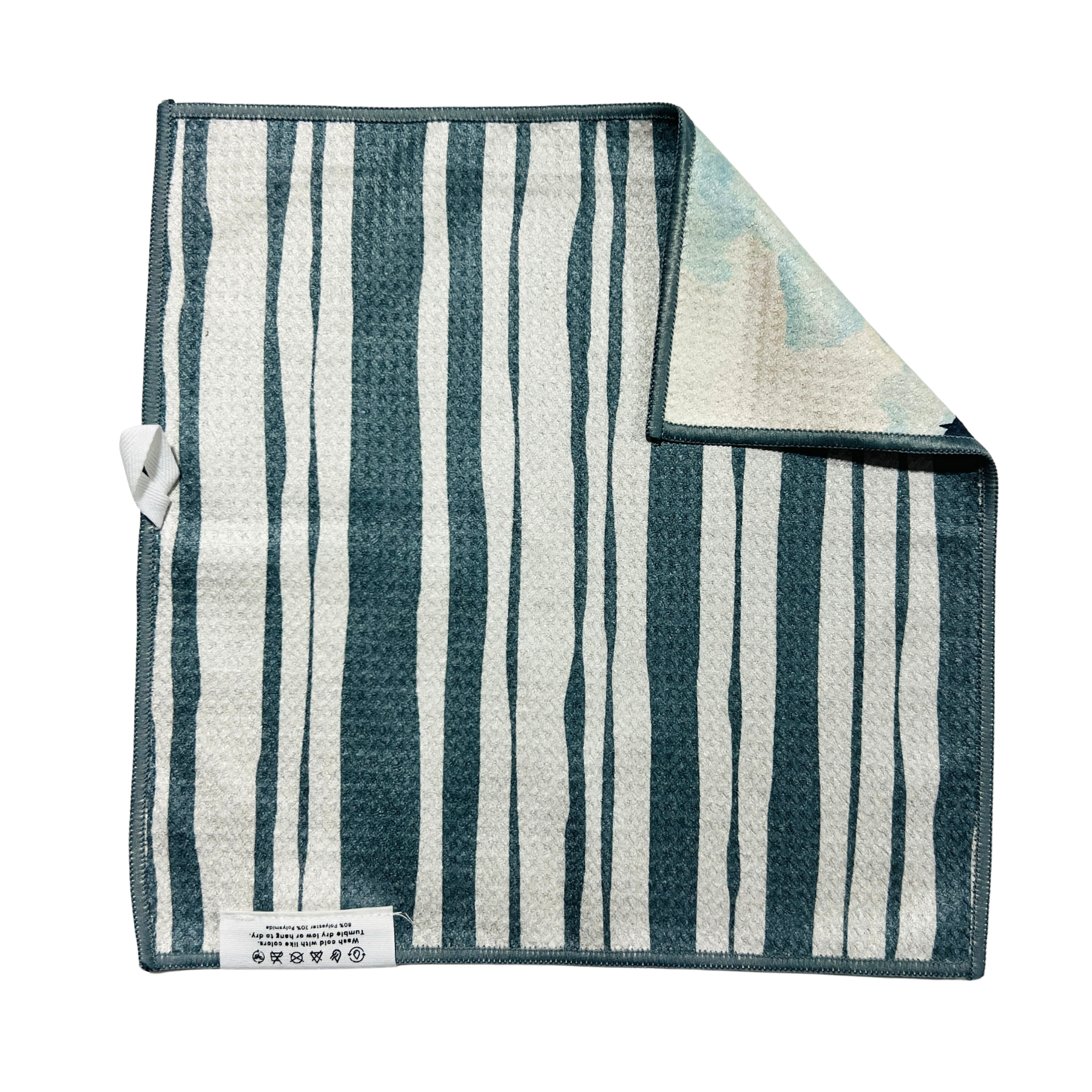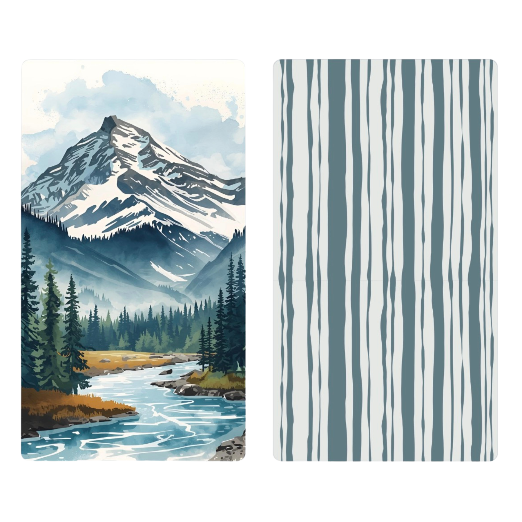 Bring the beauty of Big Sky, Montana into your home with our Lone Peak Reversible Towel. This double-sided design features a watercolor alpine landscape on one side and a modern, abstract pattern inspired by the mountain’s vertical lines on the other.