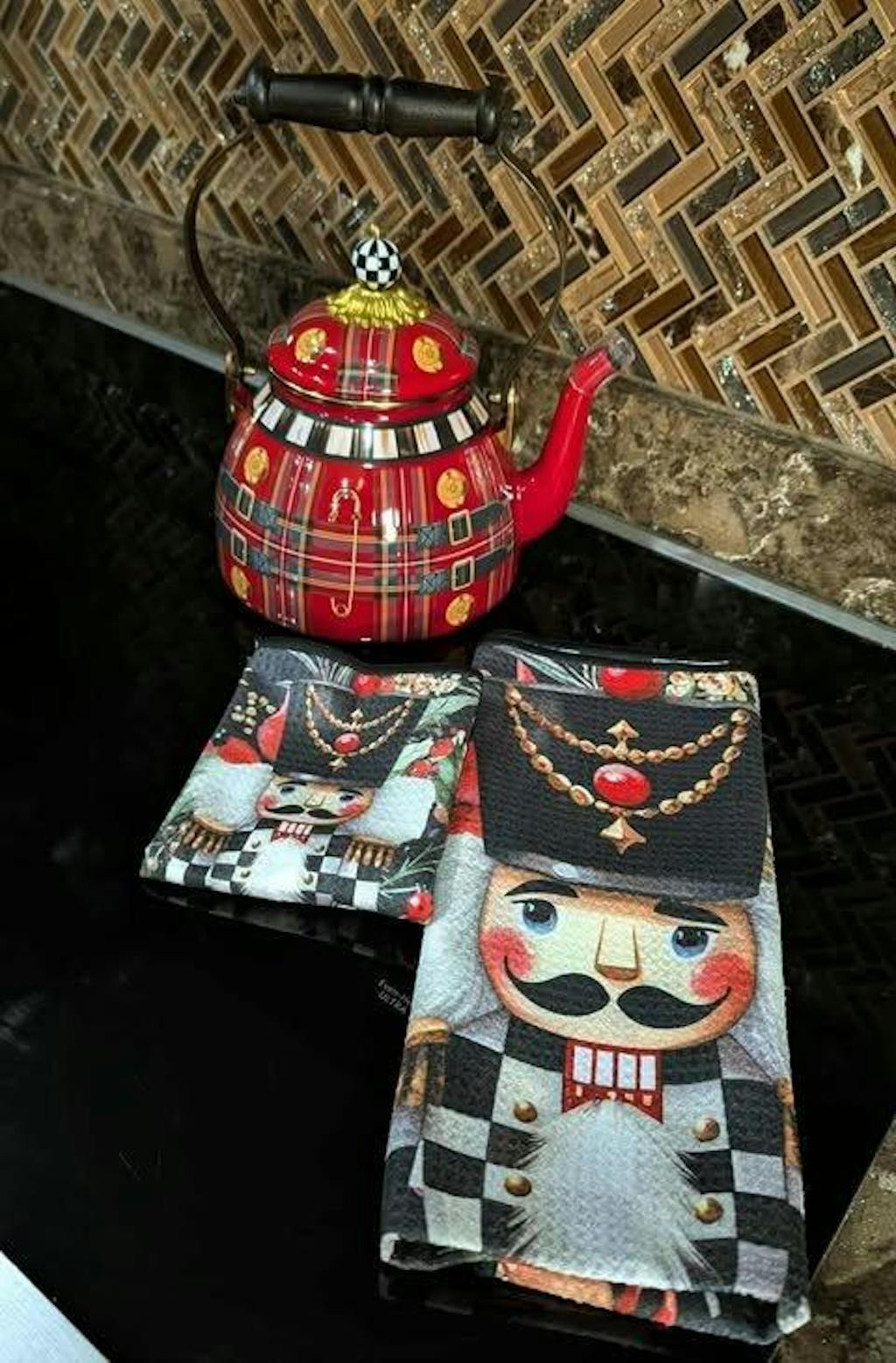 Bring a touch of holiday grandeur and bold style to your home with our captivating reversible towel – two prints, one towel! One side features a striking Nutcracker soldier in his classic black and white checkered uniform adorned with gold accents and a bright red bell, all set against a rich, dark backdrop of deep green foliage and festive red berries. Flip it over for a timeless and graphic statement with a crisp black and white checkerboard pattern. It's the perfect blend of traditional charm and contemporary cool!