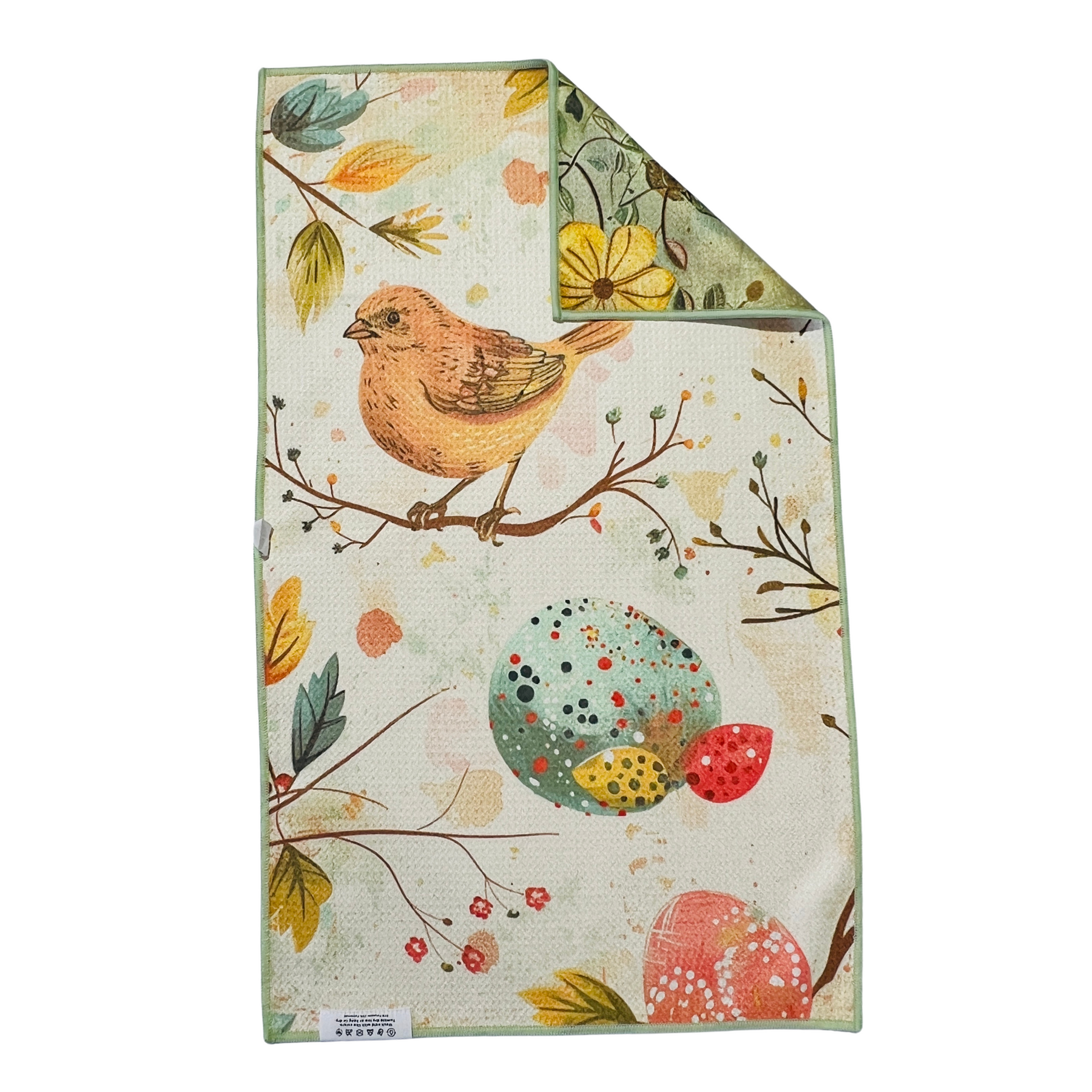 Spring birds and speckled eggs meet in this towel, bringing a touch of nature's charm and seasonal delight to your day! One side features a floral pattern with birds and pink, yellow, blue, and green accents on a light green background, while the other showcases a bird perched on a branch with speckled eggs in brown, blue, red, and yellow tones on a cream canvas, all finished with a sage green stitch.