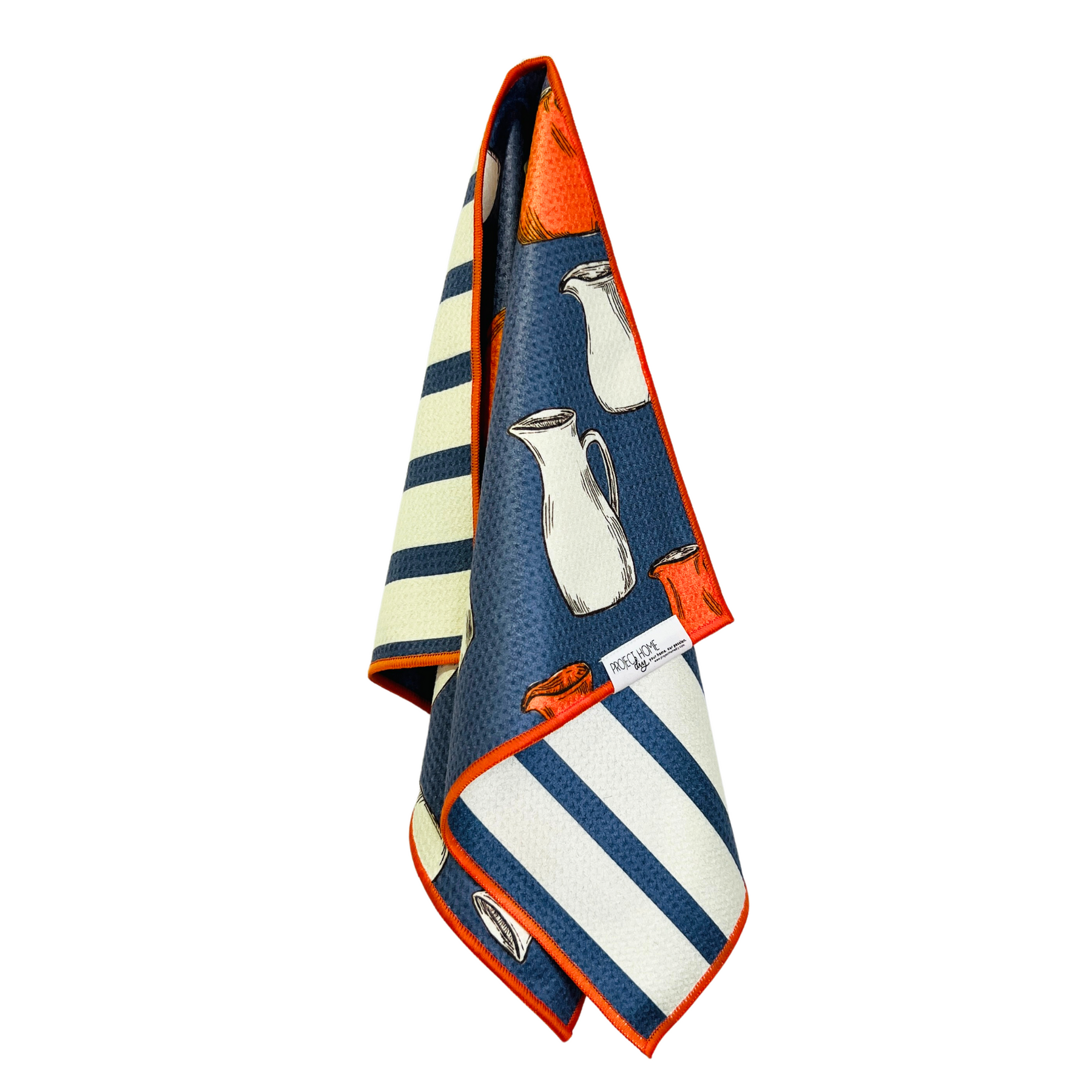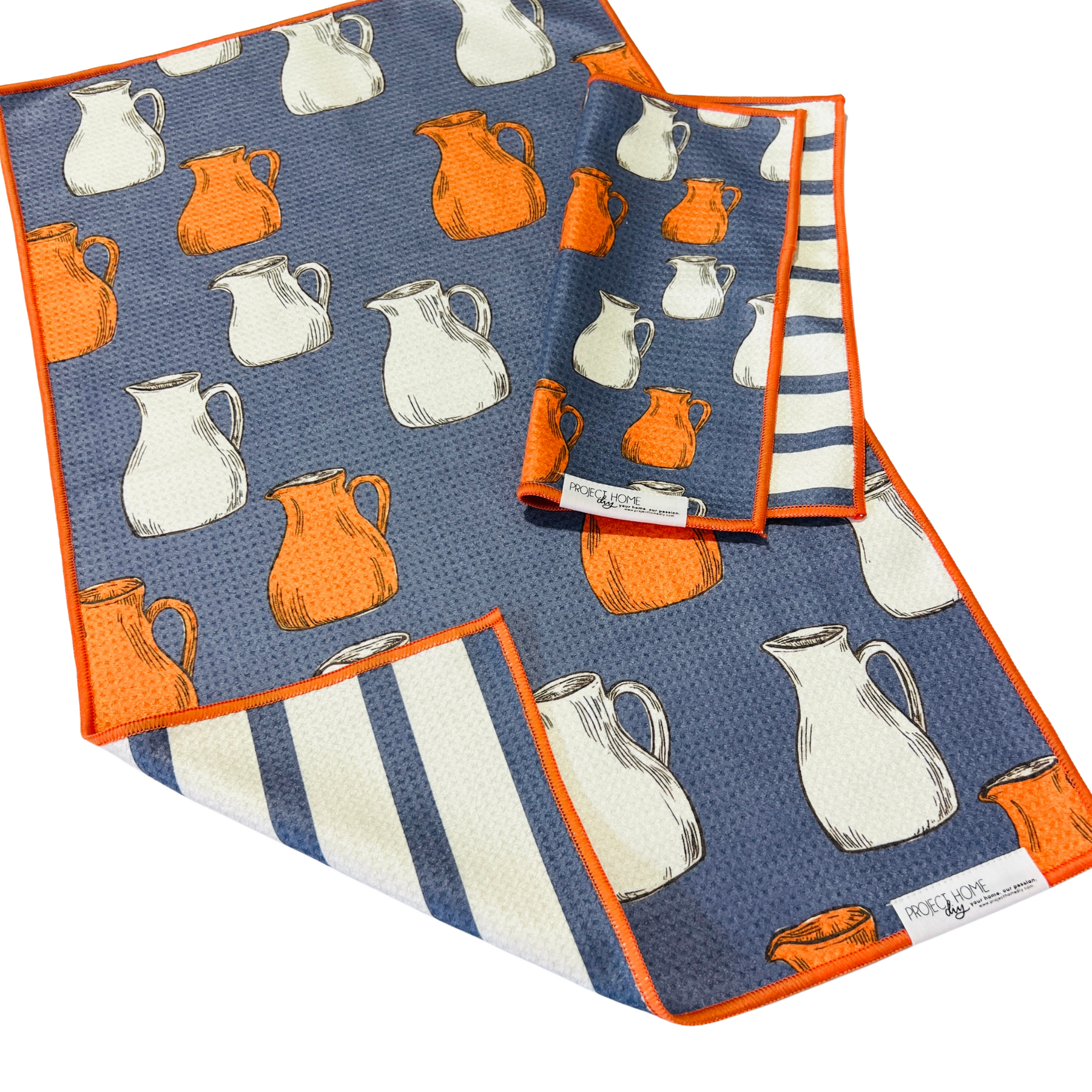 Vintage pitchers meet classic stripes in this towel, bringing a touch of rustic charm and timeless pattern to your day! One side features a repeating pattern of white and orange pitchers on a blue-gray background, while the other showcases dark blue and cream stripes, all finished with an orange stitch.