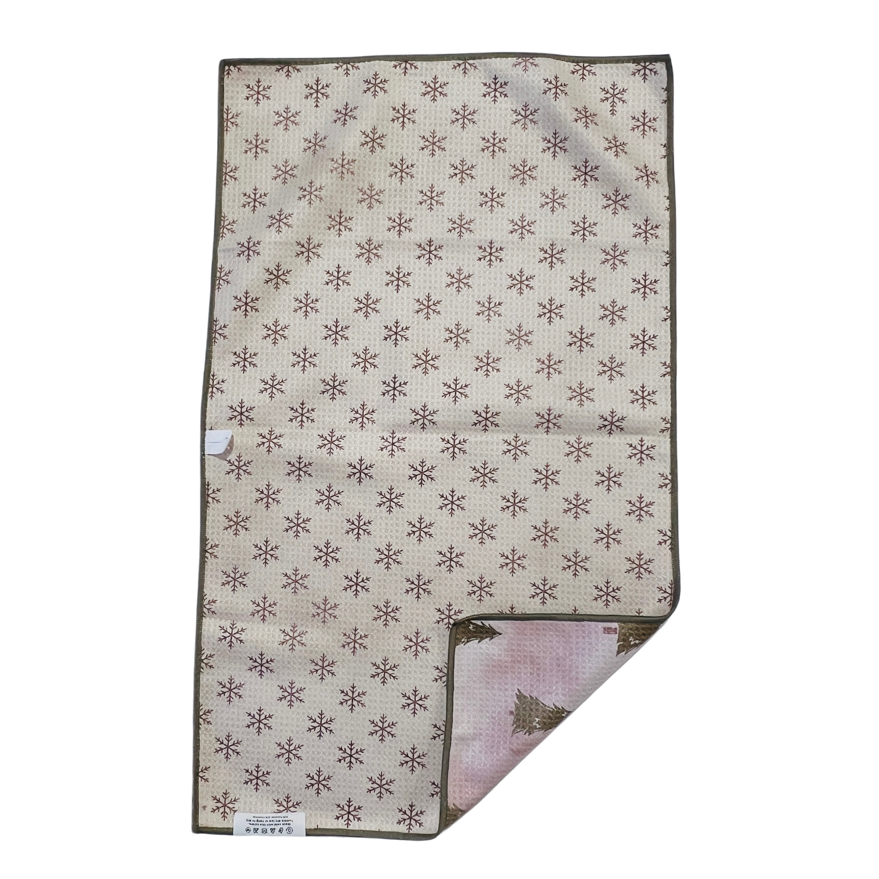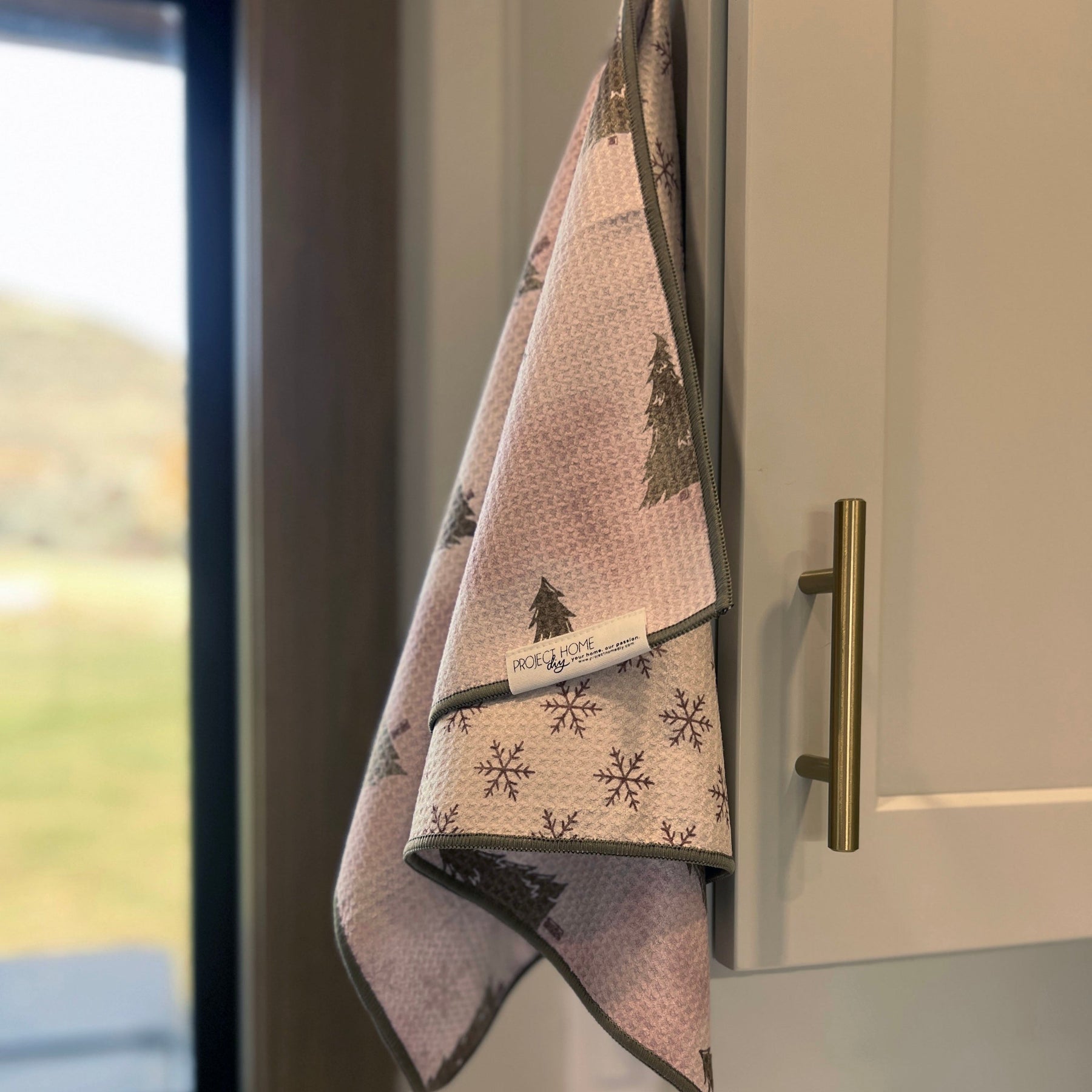 Winter pines meet delicate snowflakes in this towel, bringing a touch of seasonal charm to your day! One side features green pine trees on a light gray textured background, while the other showcases a repeating pattern of light gray snowflakes on a light gray canvas, all finished with a green stitch.