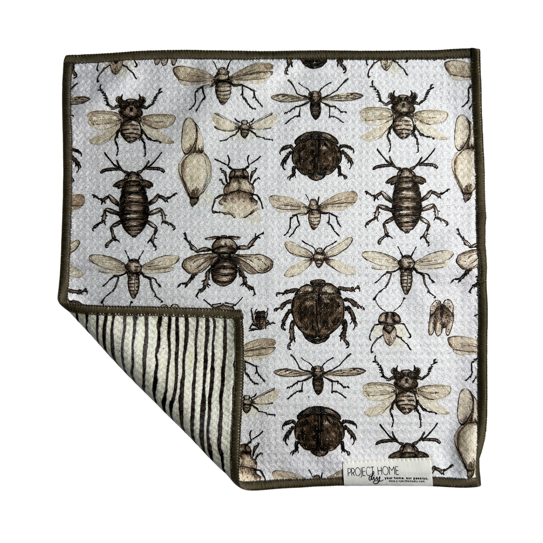 Curious insects meet hand-drawn lines in this towel, bringing a touch of natural wonder and artistic flair to your day! One side features a detailed insect pattern with black, brown, and white accents on a cream background, while the other showcases black hand-drawn lines on a white canvas, all finished with a gray-brown stitch.