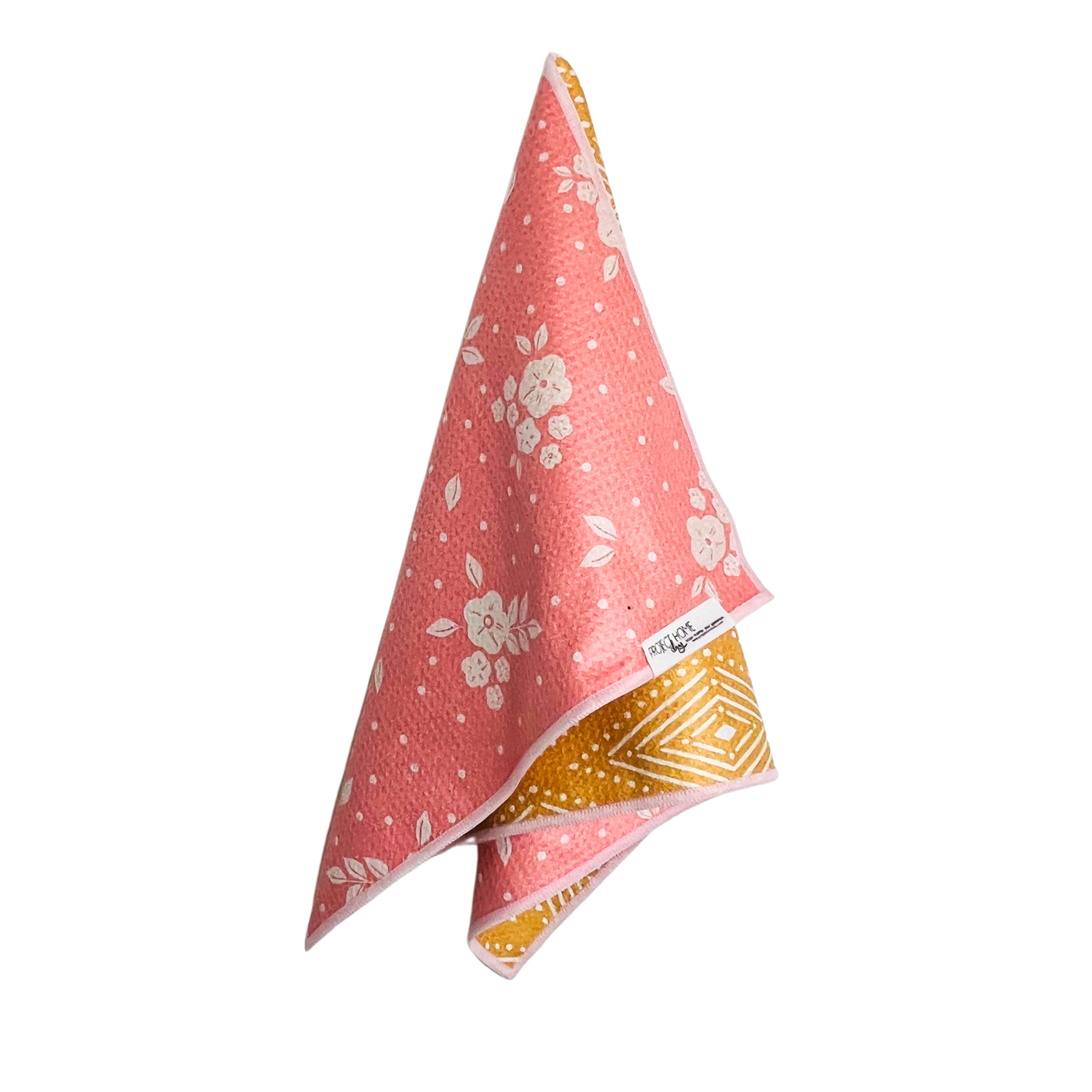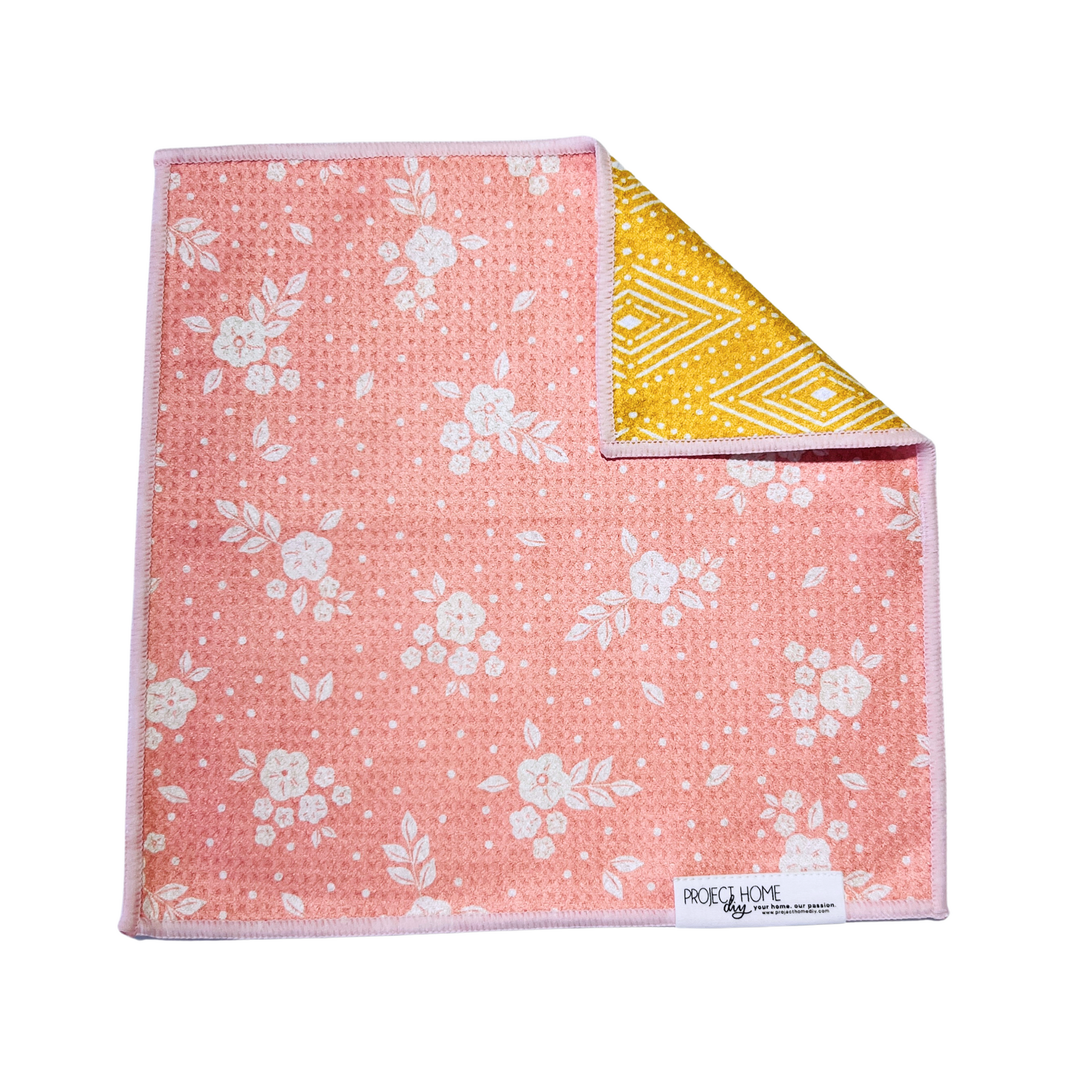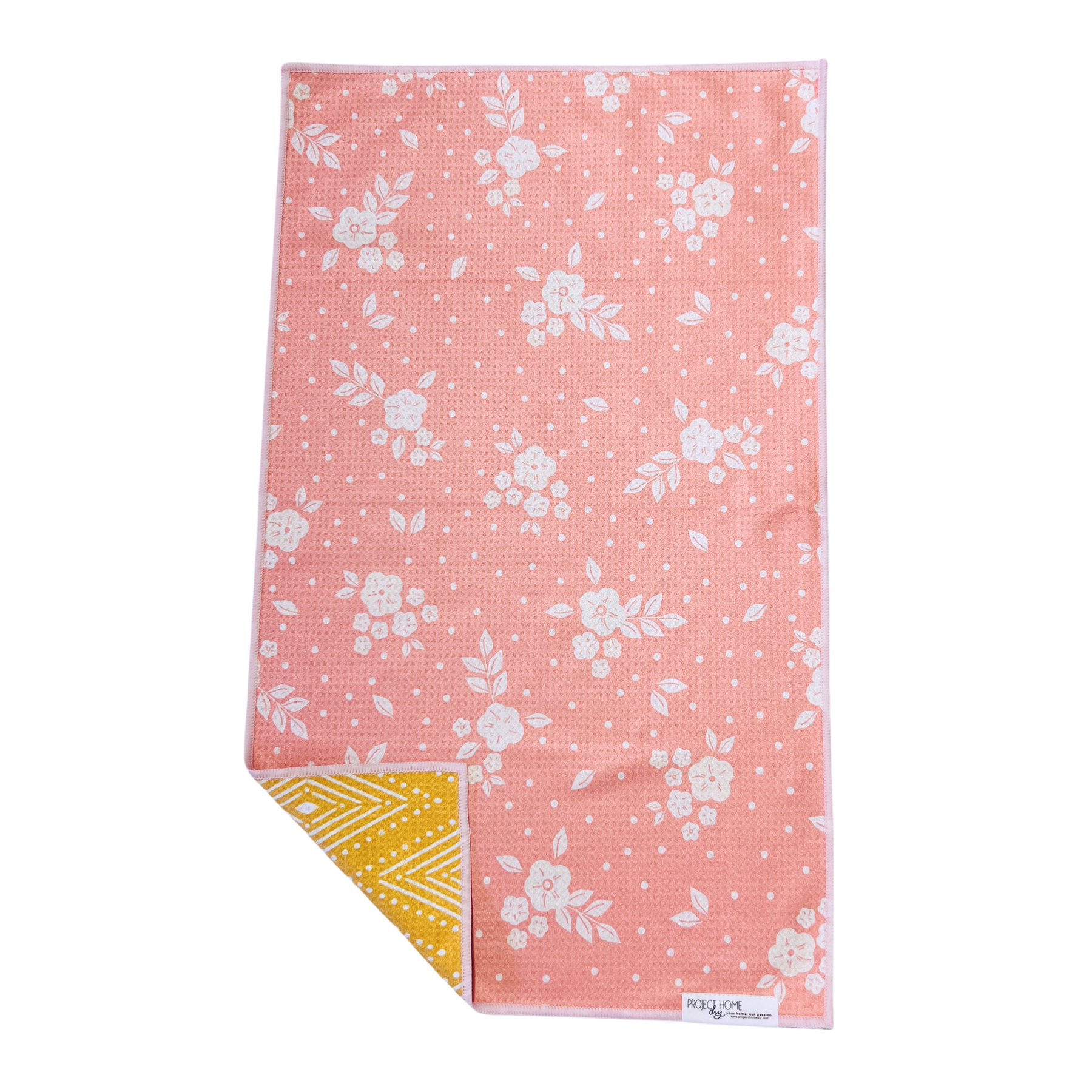 From sweet floral dreams to geometric gold, this towel adds a touch of vintage charm and modern flair! One side features delicate white florals and dots on a pink background, while the other boasts a bold gold and white geometric pattern, all finished with a soft beige stitch.
