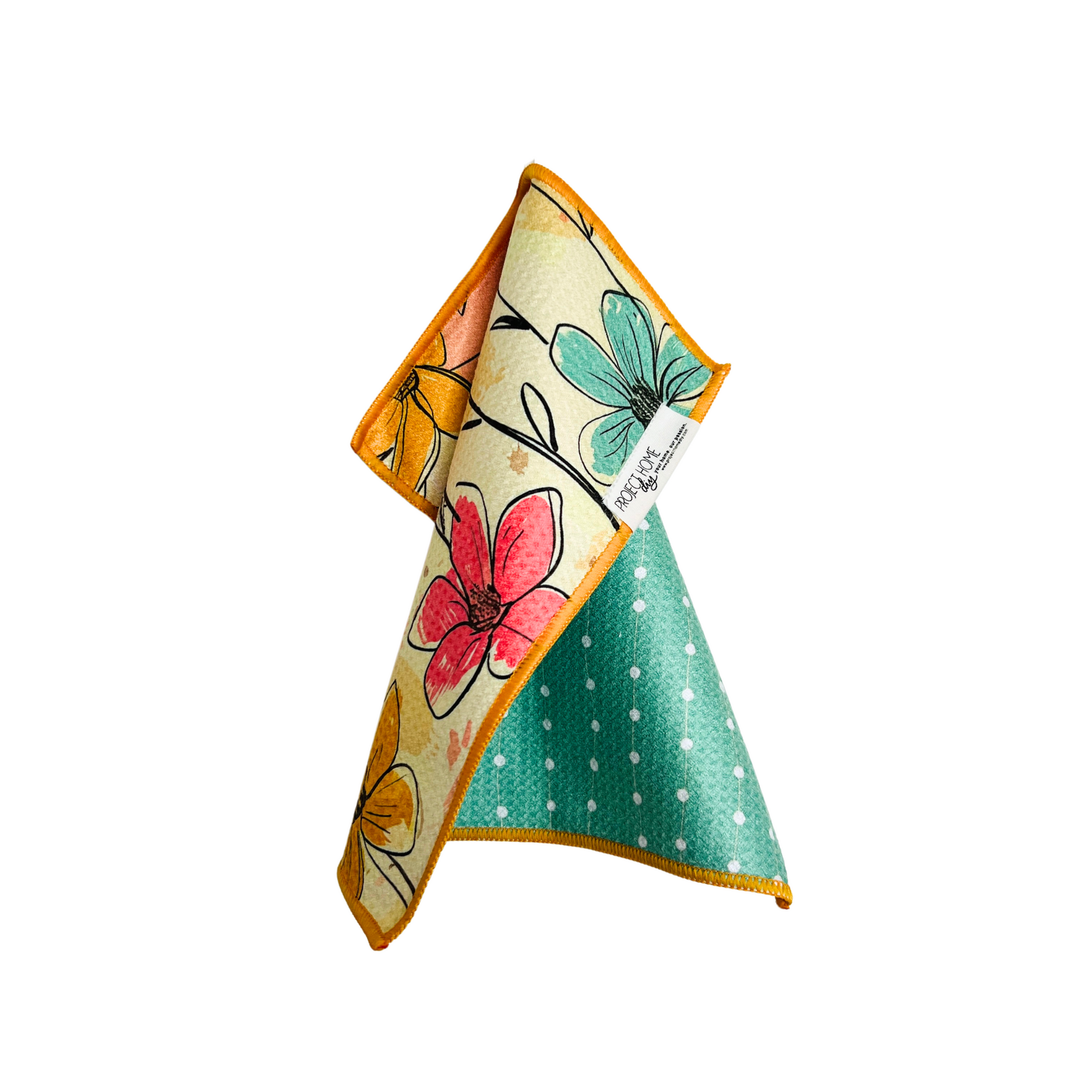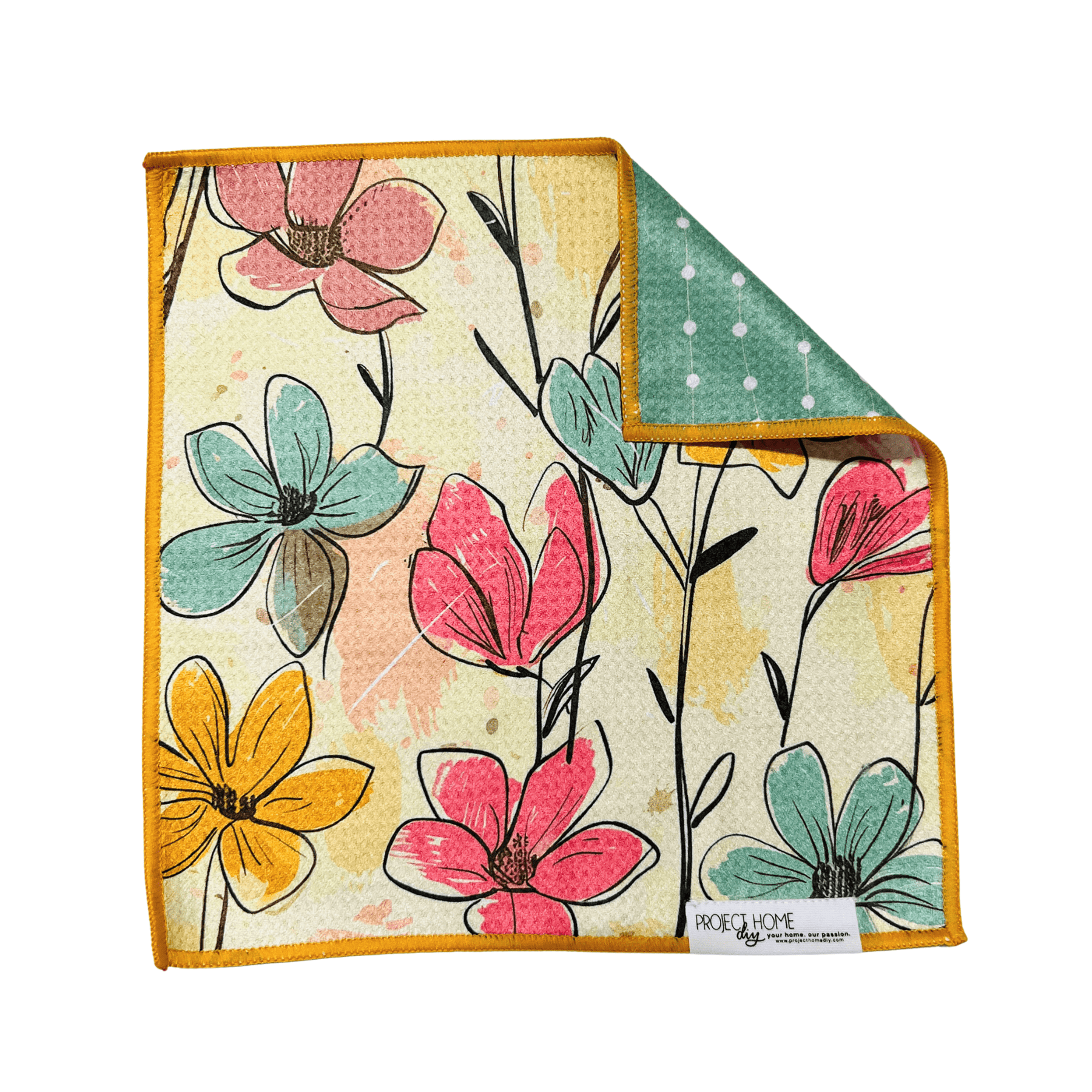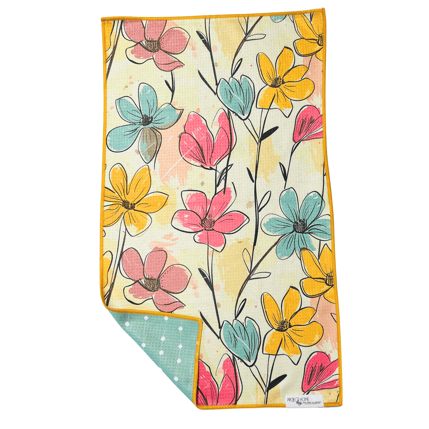 Whimsical blooms meet dotted lines in this towel, bringing a playful touch to your day! One side features sketched florals in pink, yellow, light blue, and gray on a cream background, while the other offers dotted lines in white on a teal canvas, all finished with a sunny yellow stitch.