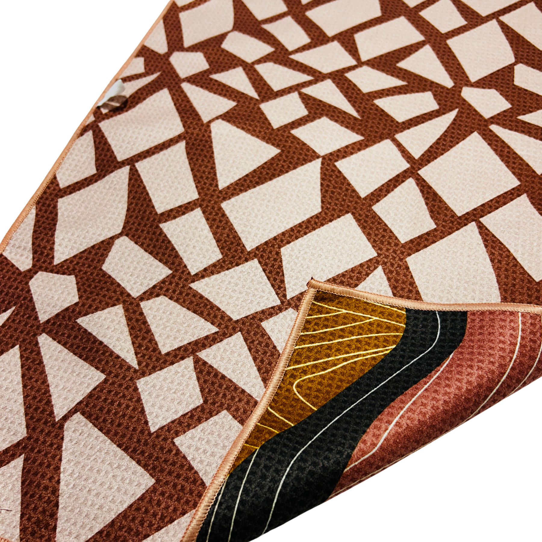 Serene Wyoming landscapes meet abstract geometry in this towel, bringing a touch of tranquil scenery and modern design to your day! One side features a stylized Heart Mountain & Grand Tetons scene with pink, blue, yellow, black, and gray accents on a cream background, while the other showcases a geometric pattern with mauve and cream shapes, all finished with a mauve stitch.